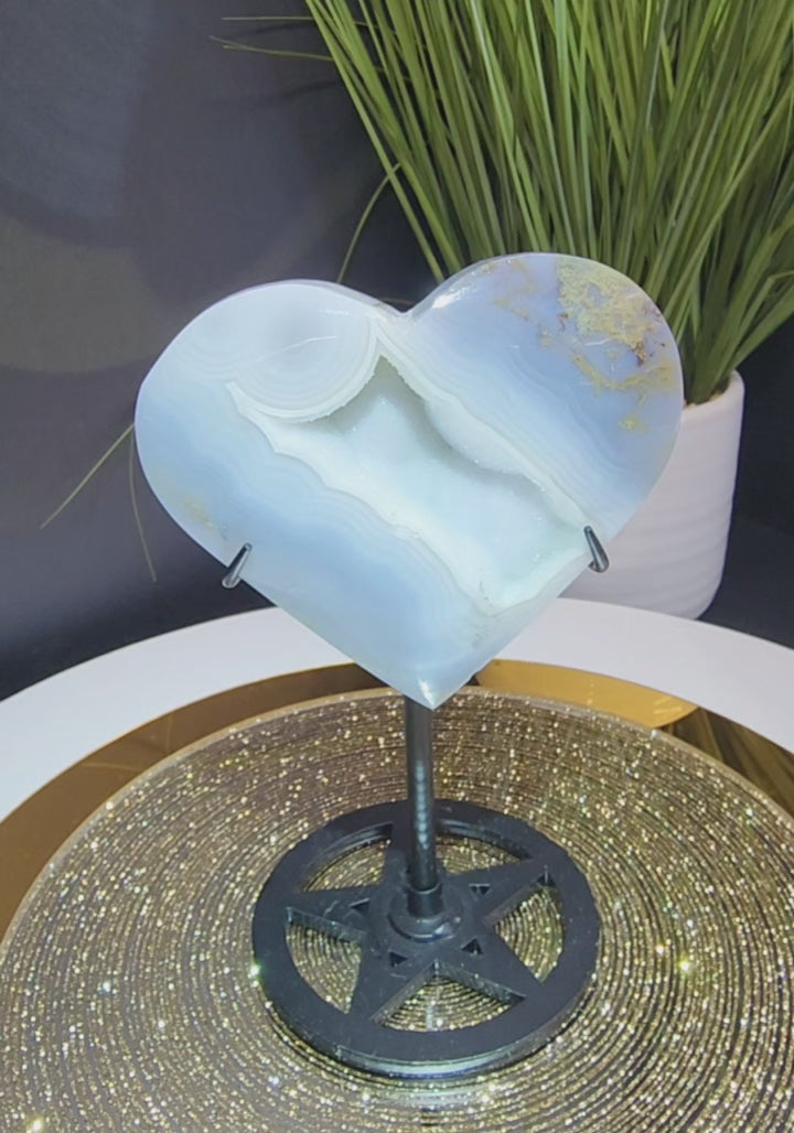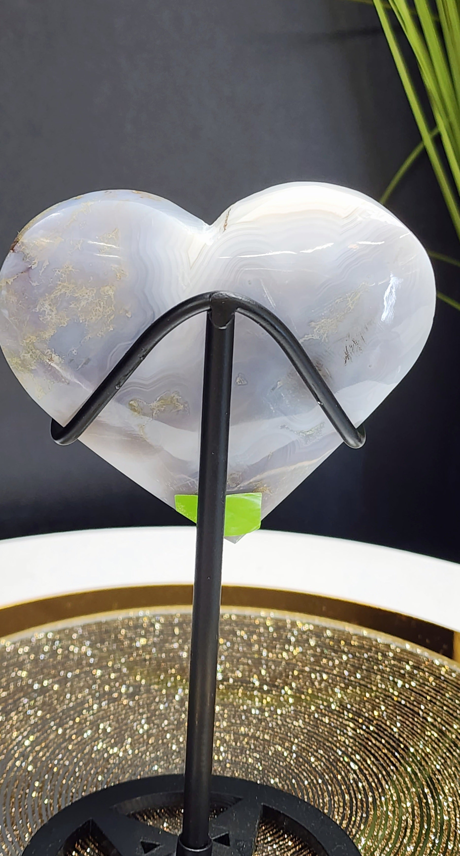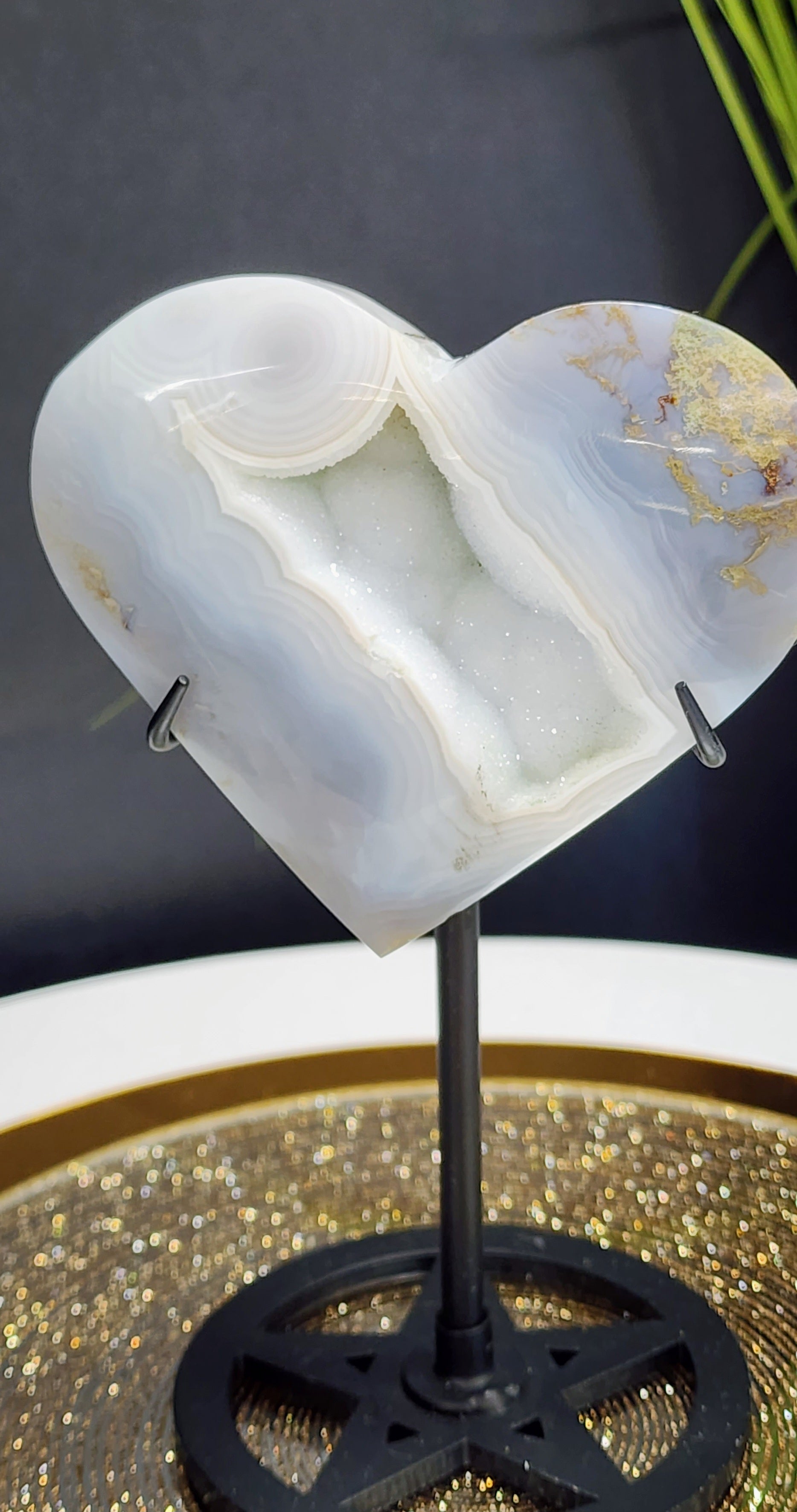 Druzy Moss Agate Heart with Banded Agate, Botryoidal druzy and Scenic Moss. Comes with stand