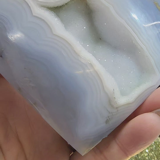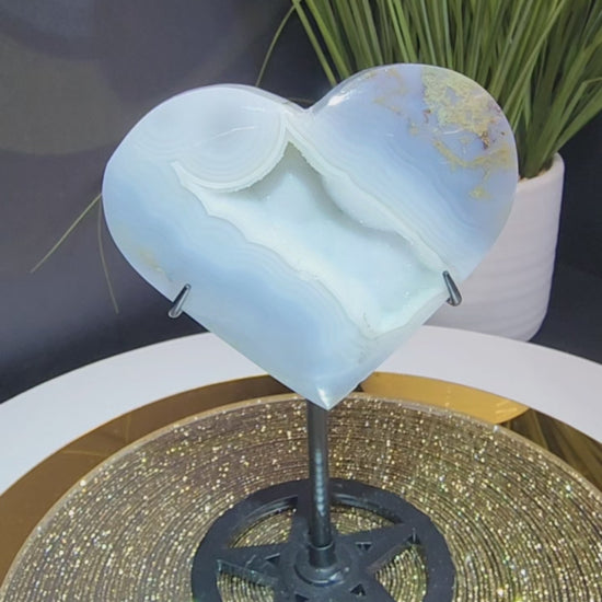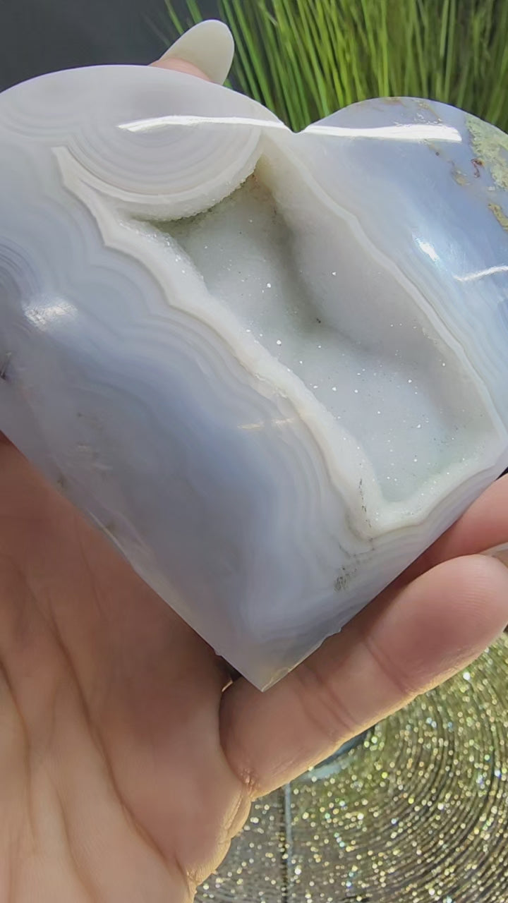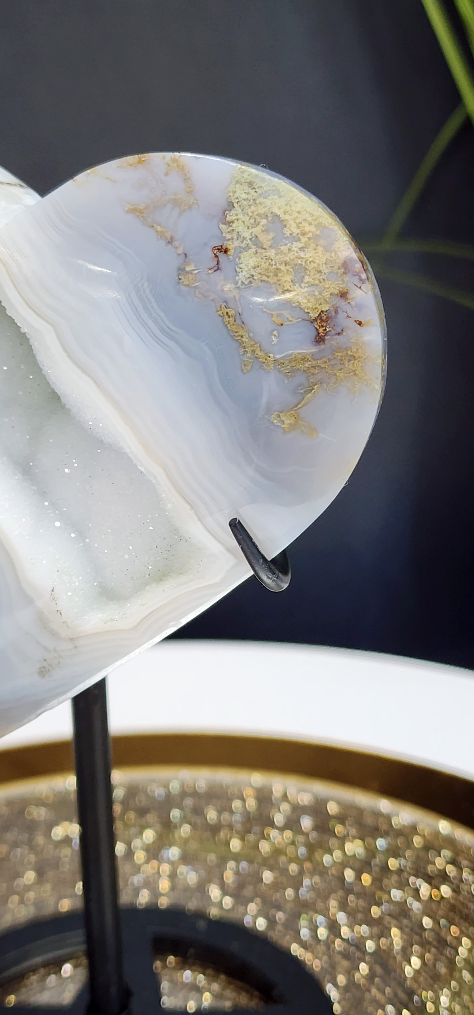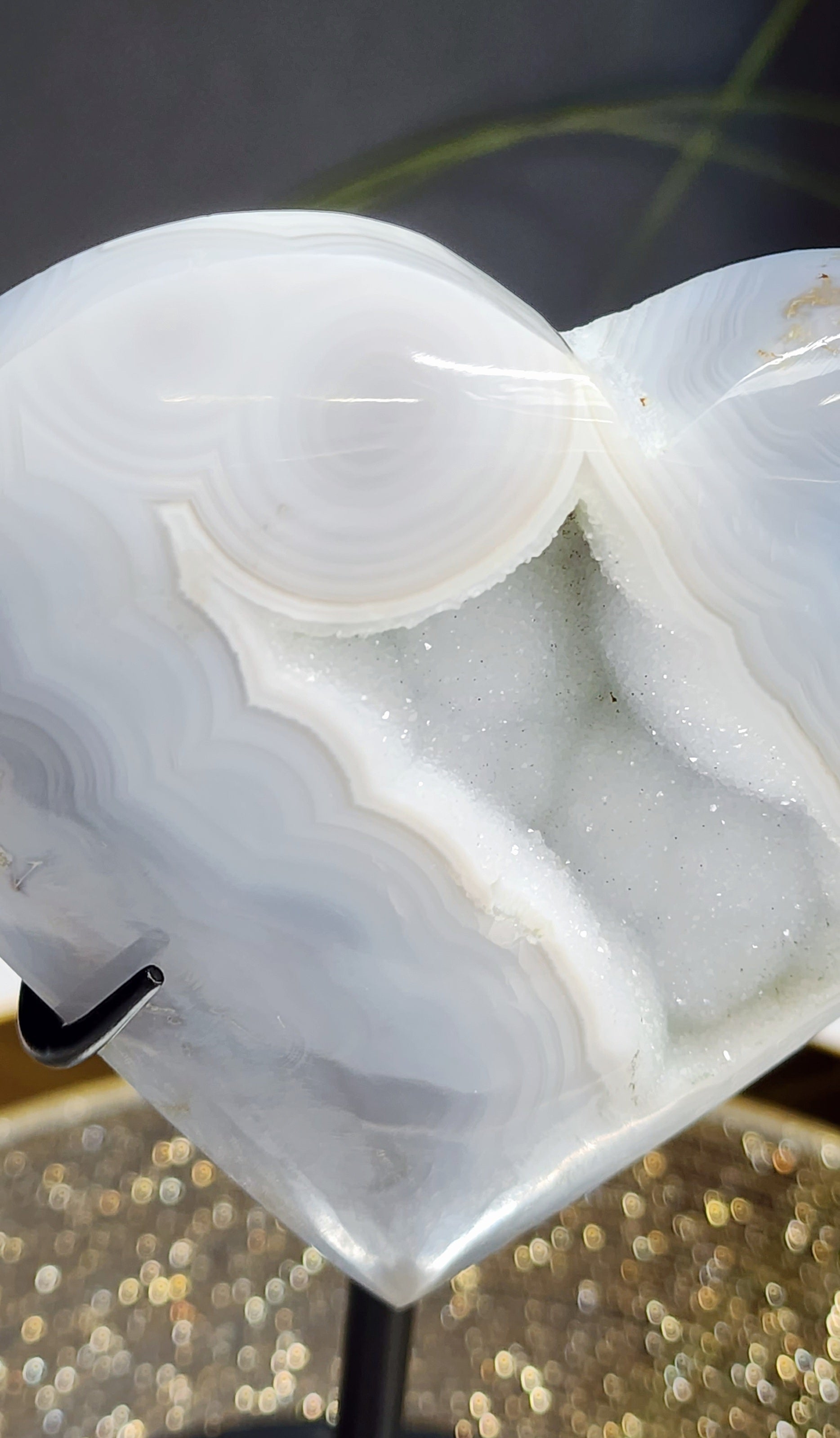 Druzy Moss Agate Heart with Banded Agate, Botryoidal druzy and Scenic Moss. Comes with stand