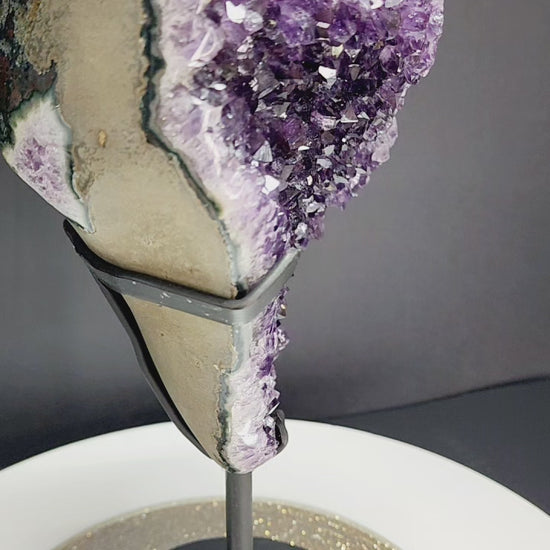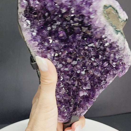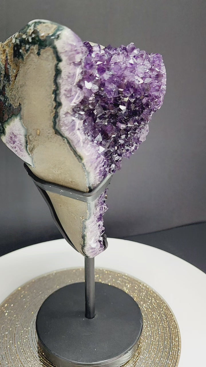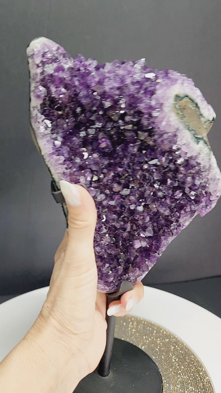 Extra Large Deep Purple Druzy Amethyst Free Form Specimen with large chunk Calcite inclusion. Comes with Metal stand