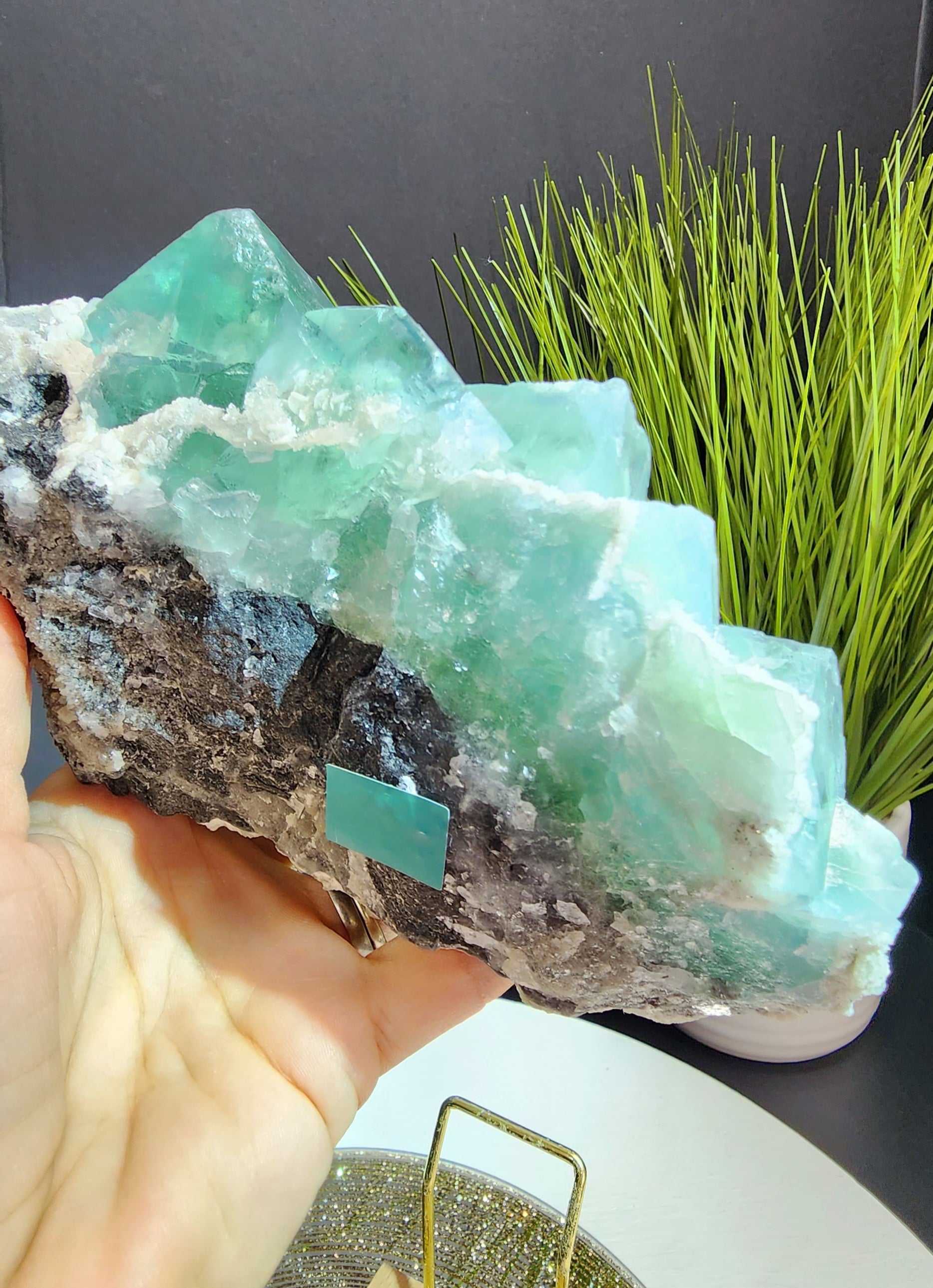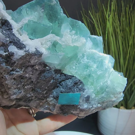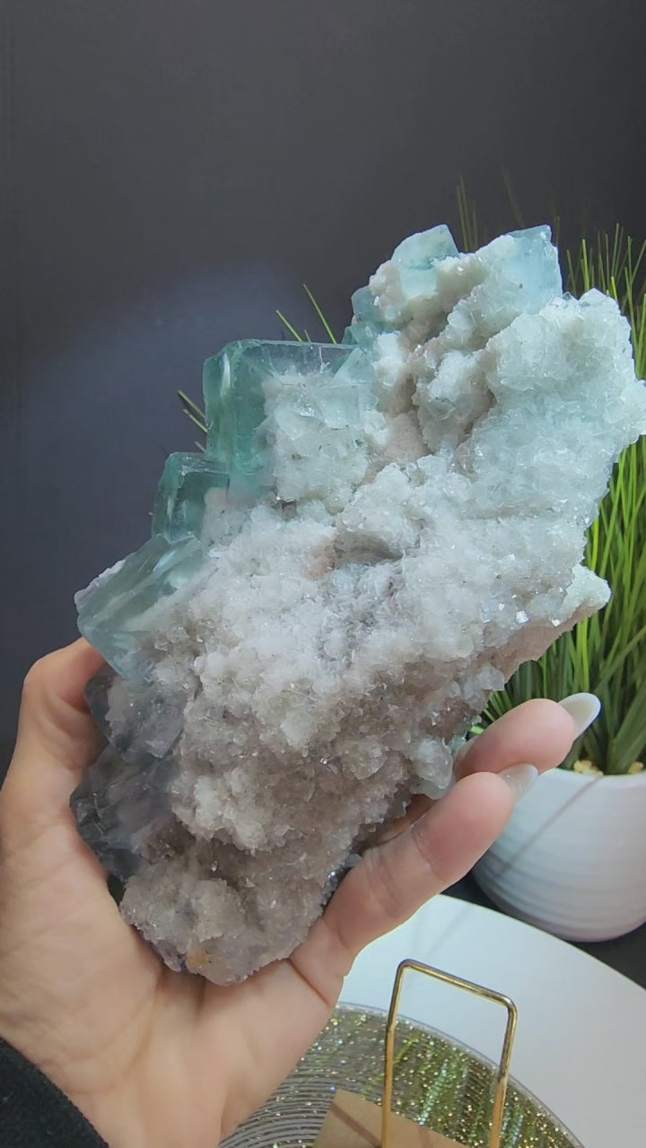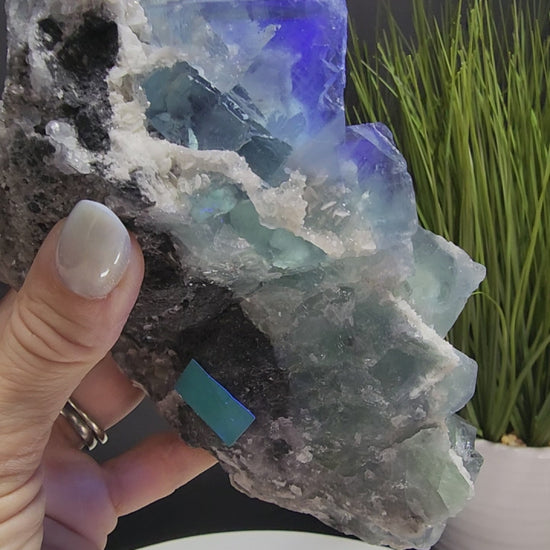 Large Clear Blue Cube Fluorite Specimen With White Barite, Dolomite, Muscovite and Smoky Quartz druzy from Zhejiang. UV