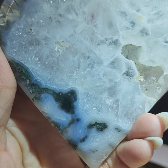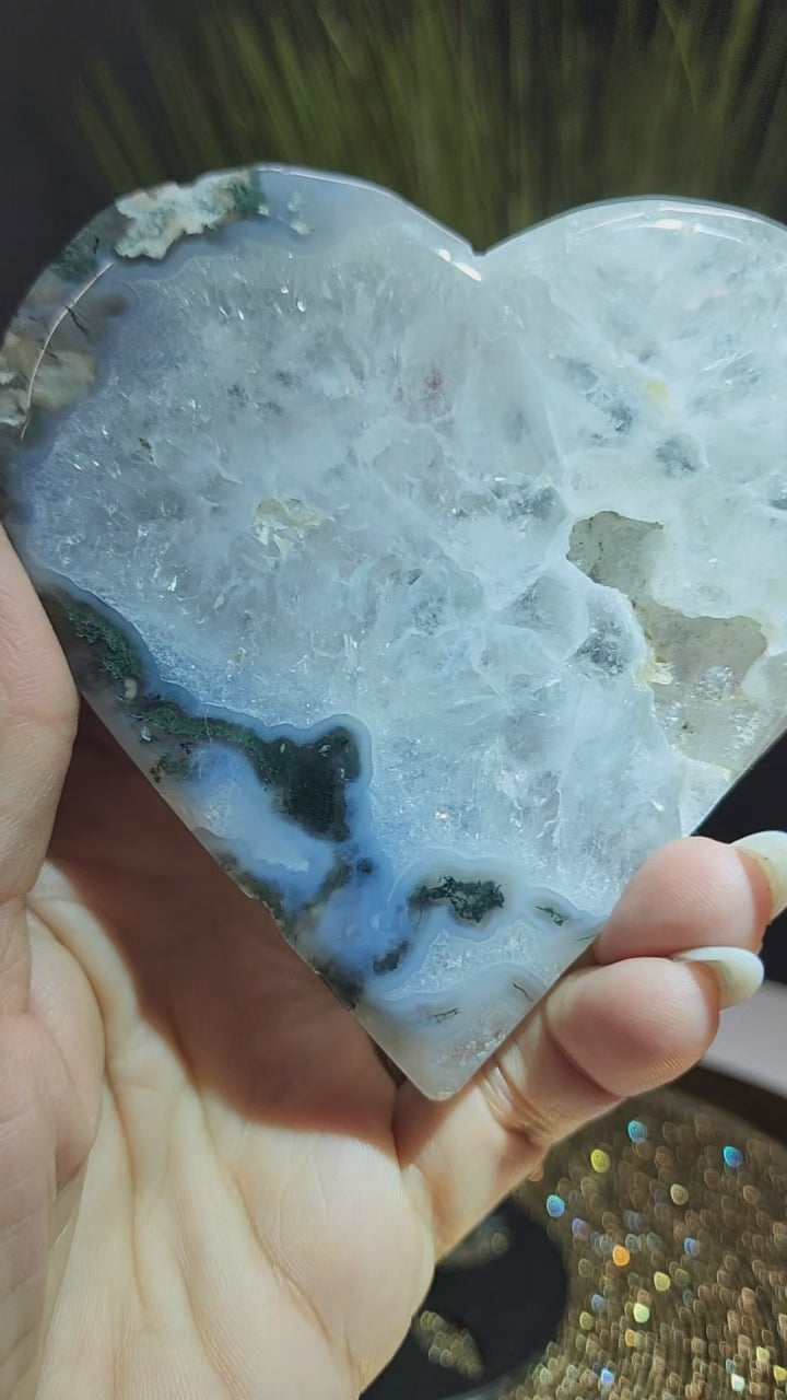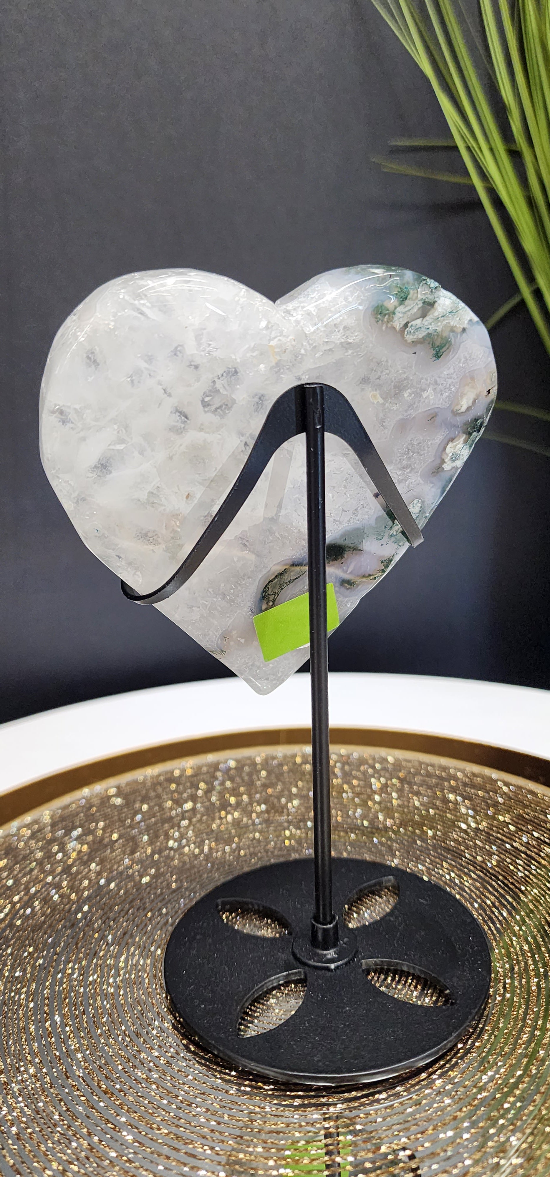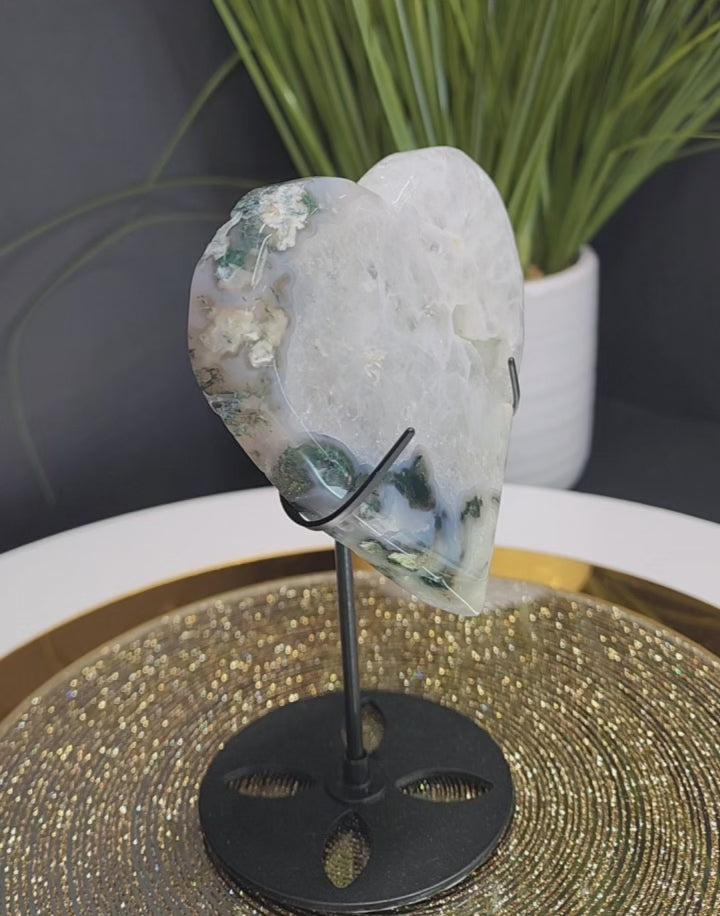 Moss Agate Heart. Comes with stand
