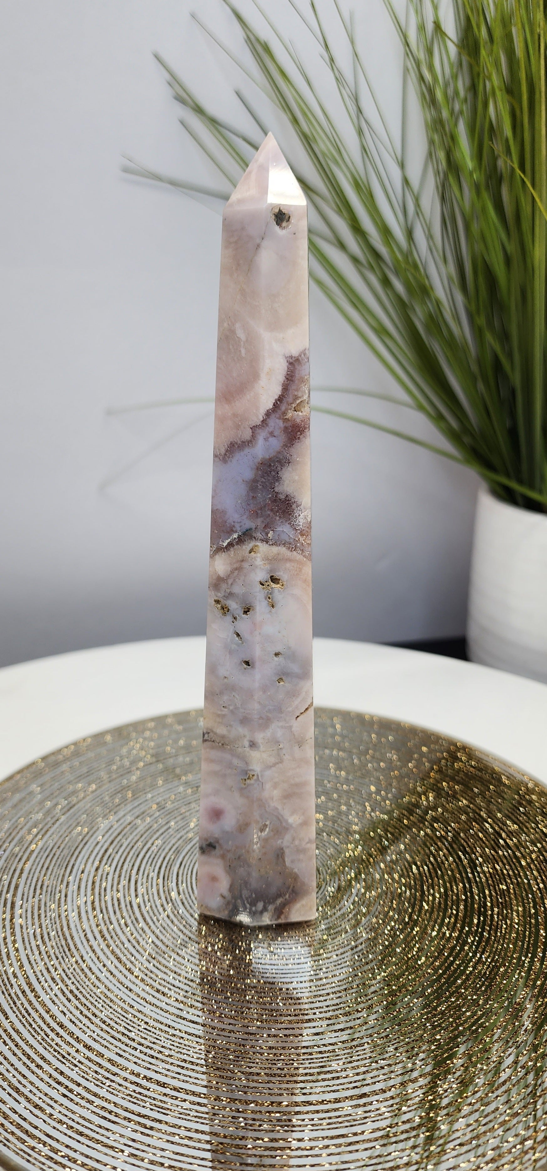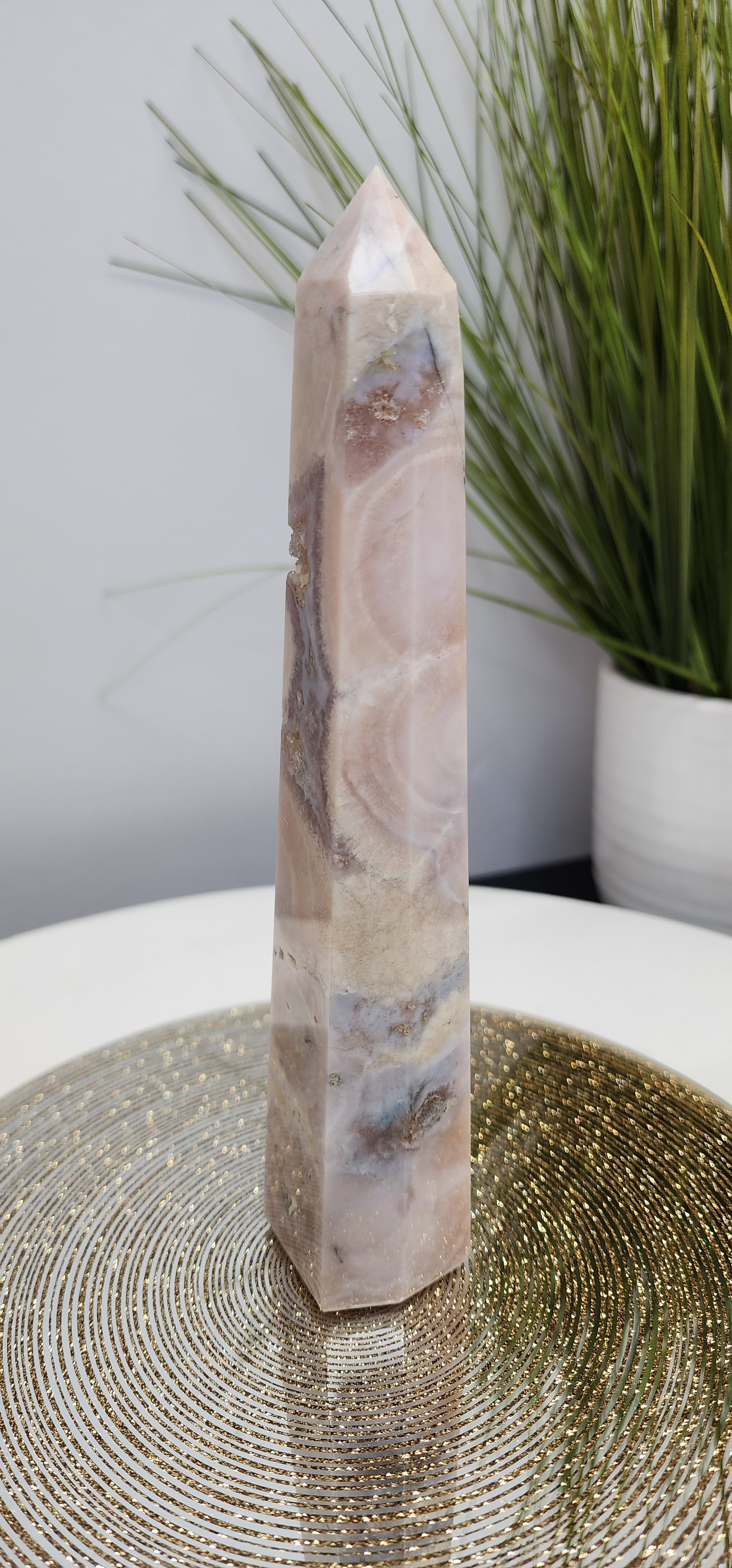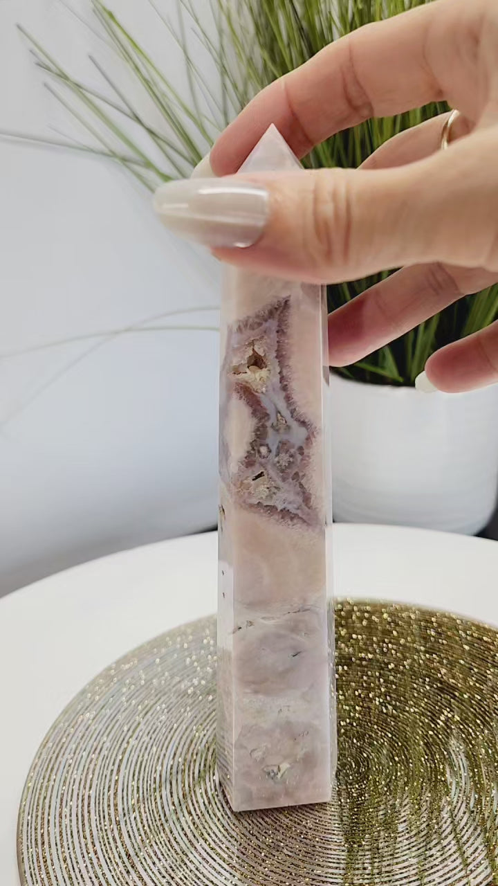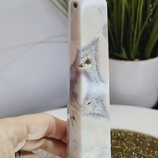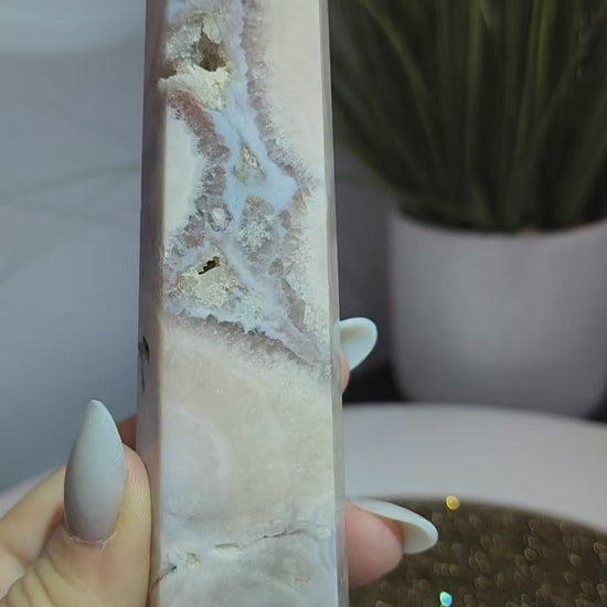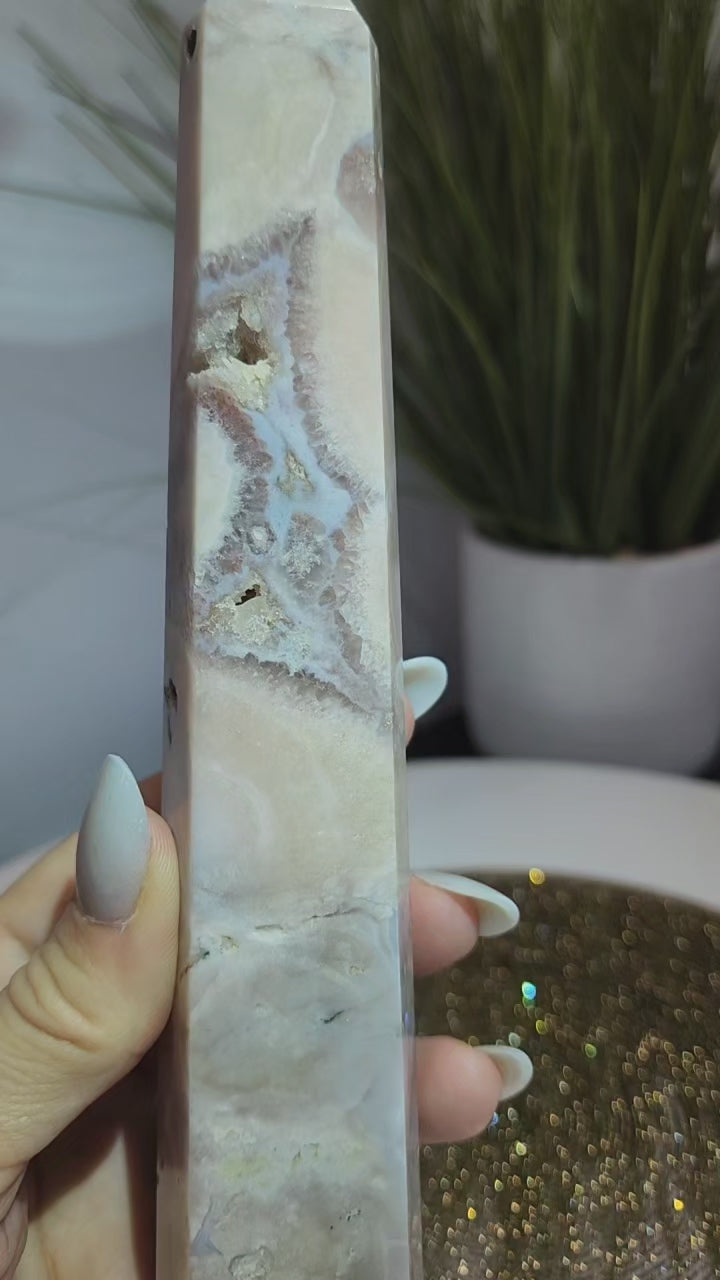 Pink Amethyst with Blue Flower Agate Tower and druzy pockets